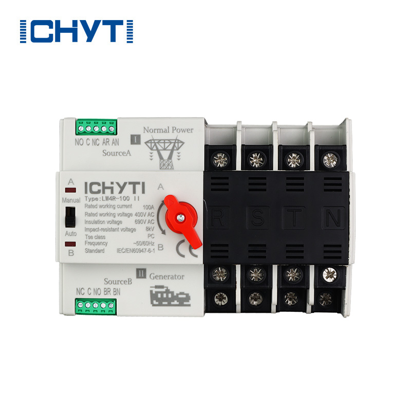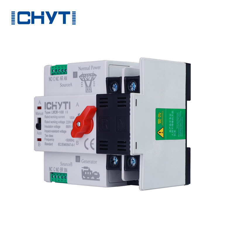 Китайският фабричен ICHYTI 100amp автоматичен превключвател е идеален за системи за аварийно захранване с 400V и 100A AC рейтинг при 50 или 60Hz. Неговият компактен дизайн, надеждна функционалност за прехвърляне, лесна инсталация и поддръжка и дълъг живот го правят популярен избор. Автоматичен превключвател 100amp е подходящ за различни приложения, където непрекъснатото захранване е от съществено значение и може да се управлява както електрически, така и ръчно. LW2R Series 100amp автоматичен трансферен превключвател отговаря на изискванията на IEC60947-6-1 за комутационни апарати за ниско напрежение и контролни апарати.