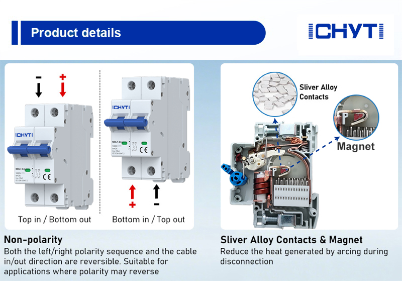 Можете да закупите миниатюрен прекъсвач DC от CHYT с увереност, тъй като ние сме опитен производител на висококачествен миниатюрен прекъсвач DC. Ние обещаваме да ви предоставим най-доброто следпродажбено обслужване и бърза доставка. Този миниатюрен автоматичен прекъсвач ICHYTI за постоянен ток на китайски доставчици е подходящ за номинални DC вериги под 1000 V, използва се главно за защита от претоварване и късо съединение и може да се използва за случайно превключване на операции. Номиналният му ток не трябва да надвишава 63A.